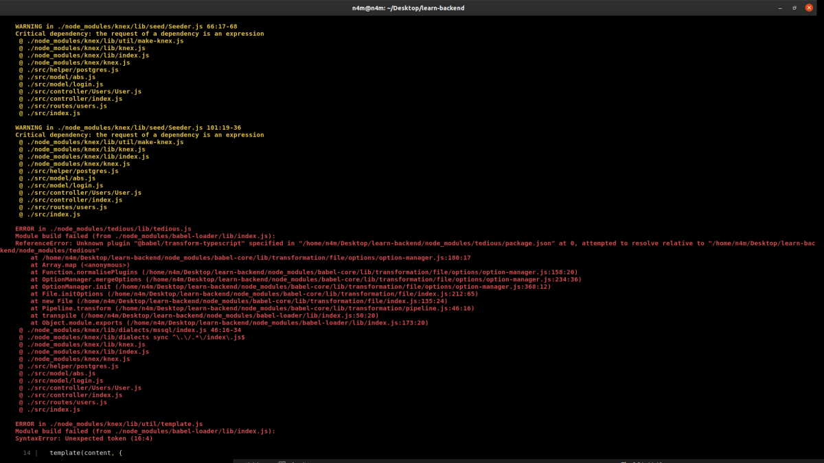 Theo như thông báo lỗi thì có vấn đề ở package tedious, có vẻ package này viết bằng typescript và nó require plugin @babel/transform-typescript để build code, nhưng bạn đang chưa có plugin này. Bạn thử cài đặt bằng câu lệnh npm hay yarn xem sao