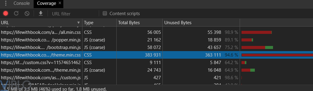 Khi kiểm tra website trên chrome dev thì mình thấy tab Converage các tệp được tải nhưng chỉ sử dụng 1 phần.