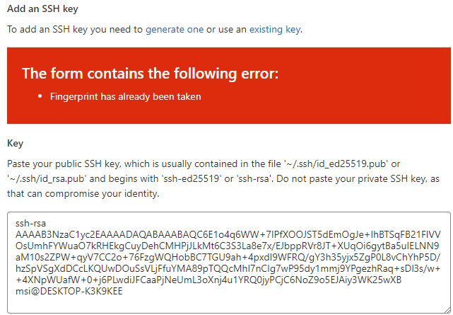 Lỗi ở trên của bạn là do bạn đã add cái ssh key đó vào một account khác rồi, và bạn cần phải tạo mới một ssh key khác để dùng cho account này.