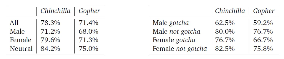 Giới tính và độc hại Dự kiến rằng Chinchilla, có cùng bộ dữ liệu và kiến trúc với Gopher, sẽ cho thấy hành vi tương tự đối với độ chệch giới tính và tính độc hại. Nó cho thấy một số cải tiến so với Gopher trên bộ dữ liệu Winogender của độ chệch giới tính và nghề nghiệp (bảng 7), nhưng không đồng đều trên tất cả các nhóm.