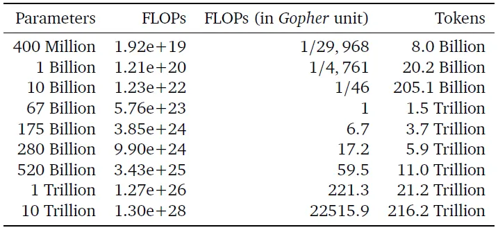 Như được thể hiện trong bảng 3 (phương pháp đầu tiên), một mô hình 175 tỷ thông số (tương tự như GPT-3) nên được đào tạo với ngân sách tính toán là 3,85x10²⁴ FLOPs và được đào tạo trên 3,7 nghìn tỷ mã thông báo (hơn 10 lần so với OpenAI sử dụng cho mô hình GPT-3 175 tỷ thông số của họ). Một mô hình 280 tỷ thông số (tương tự như Gopher) nên được đào tạo với ngân sách tính toán là 9,90x10²⁴ FLOPs và trên 5,9 nghìn tỷ mã thông báo đào tạo (tức là gấp 20 lần số lượng mã thông báo mà DeepMind đã sử dụng cho mô hình Gopher).