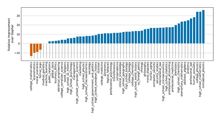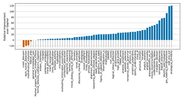 So sánh kết quả: Chinchilla so với Gopher và các mô hình khác Nói rằng Chinchilla vượt trội hơn Gopher là quá nhẹ nhàng khi chúng ta xem xét kết quả cho từng bài kiểm tra. Để không quá tải bài viết với các biểu đồ, dưới đây tôi chỉ sẽ hiển thị kết quả cho hai bài kiểm tra quan trọng nhất là Massive Multitask Language Understanding (MMLU) và Big-bench (chiếm 80% các bài kiểm tra) và các bài kiểm tra liên quan đến đạo đức - luôn xứng đáng được xem xét kỹ lưỡng hơn. (Xem phần 4 của bài báo cho một phân tích chi tiết bao gồm các bài kiểm tra đọc, hiểu biết thông thường và câu hỏi và trả lời.)