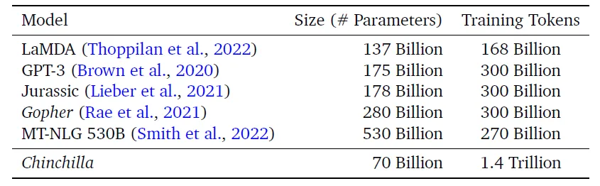 Các mô hình như GPT-3, Gopher và MT-NLG theo luật tỉ lệ của Kaplan (Bảng 1). Ví dụ cụ thể, nếu ngân sách tính toán tăng lên 10 lần, luật của Kaplan dự đoán hiệu suất tối ưu khi kích thước mô hình tăng lên 5,5 lần và số lượng mã thông báo đào tạo tăng lên 1,8 lần.