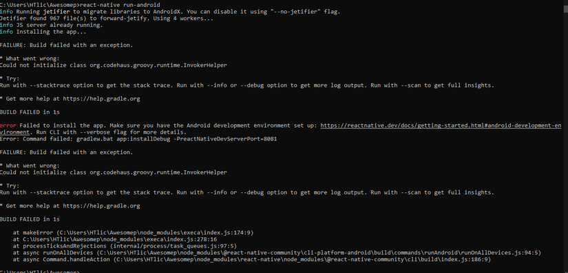anh ơi khi mà em chạy react-native run-android nó bị như vầy nó build failed và màn hình điện thoại thì không phản ứng gì