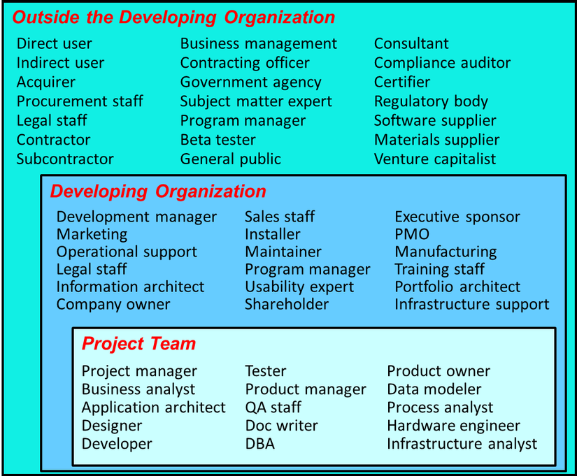 - Ouside the Developing Organization: Enduser, KH, Thành viên chính phủ, Tester của bên thứ 3...