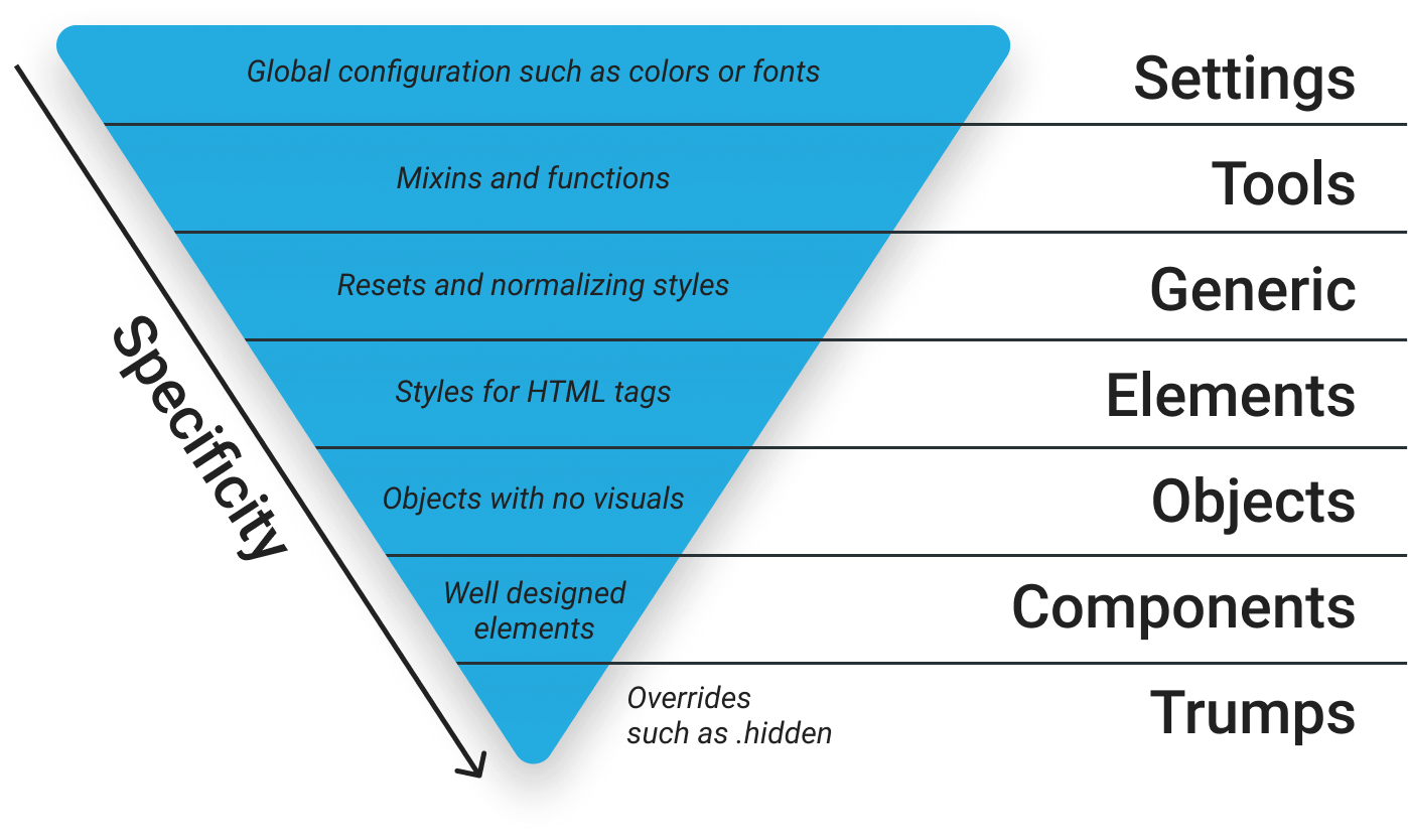 Ý tưởng mới về css Tam giác ngược là mọt cách phân lớp các thuộc tính css dựa trên mức độ cụ thể và tầm quan trọng của họ. Đây là một phương pháp it được biết đến so với SMACSS và OOCSS -mặc dù cả đều có thể được kết hợp với ITCSS.