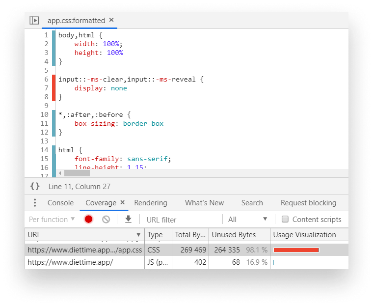Để mở nó, tìm kiếm độ phủ sóng trong bản công cụ (Tool panel). Bạn có thể mở bằng tổ hợp phím Ctrl + Shift + P . Sau khi mở, hãy bắt đầu ghi lai băng cách click vào reload icon. Tất cả một thứ sẽ hiện ra là màu đỏ và không sử dụng. Bạn cũng có thế thấy vị dụ trên thông báo đến 98% css không được sử dụng. Điều này không hoàn toàn đúng đâu, có một số css thực sự hoạt động khi nó được tương tác trên web . Đối với phần css cho mobile thì được gắn flag là bytes không sử dụng. Vì vậy trước khi bạn loại bỏ bất cứ thứ gì hãy chắc chắn nó không sử dụng bất cứ chỗ nào