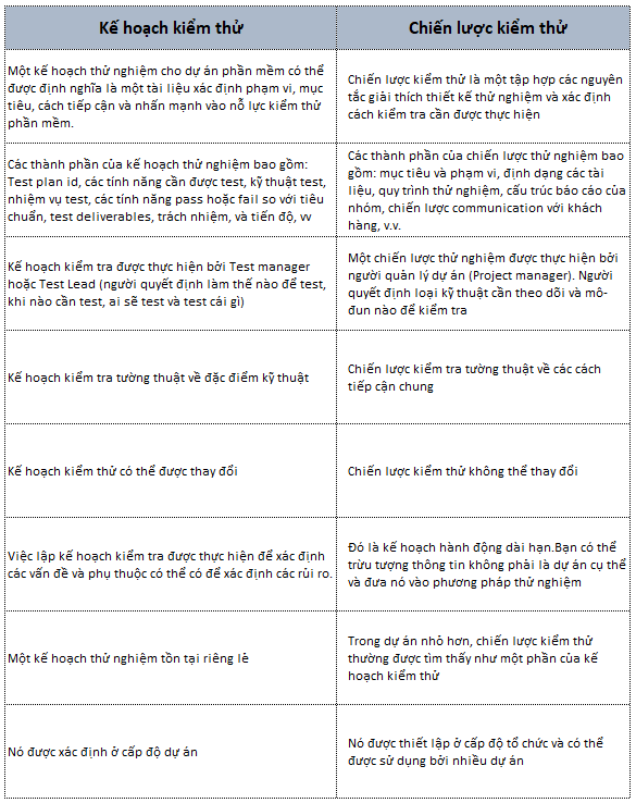 Chiến lược và kế hoạch kiểm thử thường được sử dụng cùng nhau và cũng có thể thay thế cho nhaunhưng chúng không giống nhau. Có sự khác biệt nhỏ giữa kế hoạch kiểm thử trên thiết bị di động và chiến lược kiểm thử trên thiết bị di động. Hãy cùng xem xét một số điểm khác biệt dưới đây: