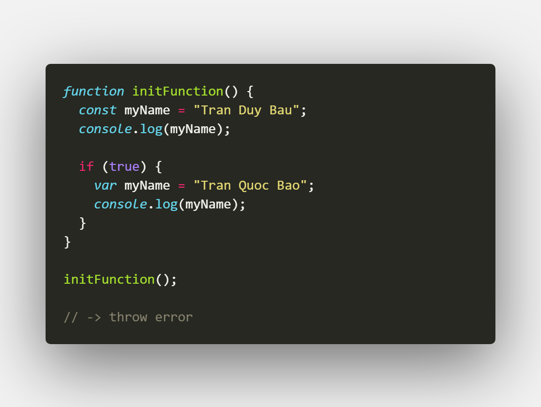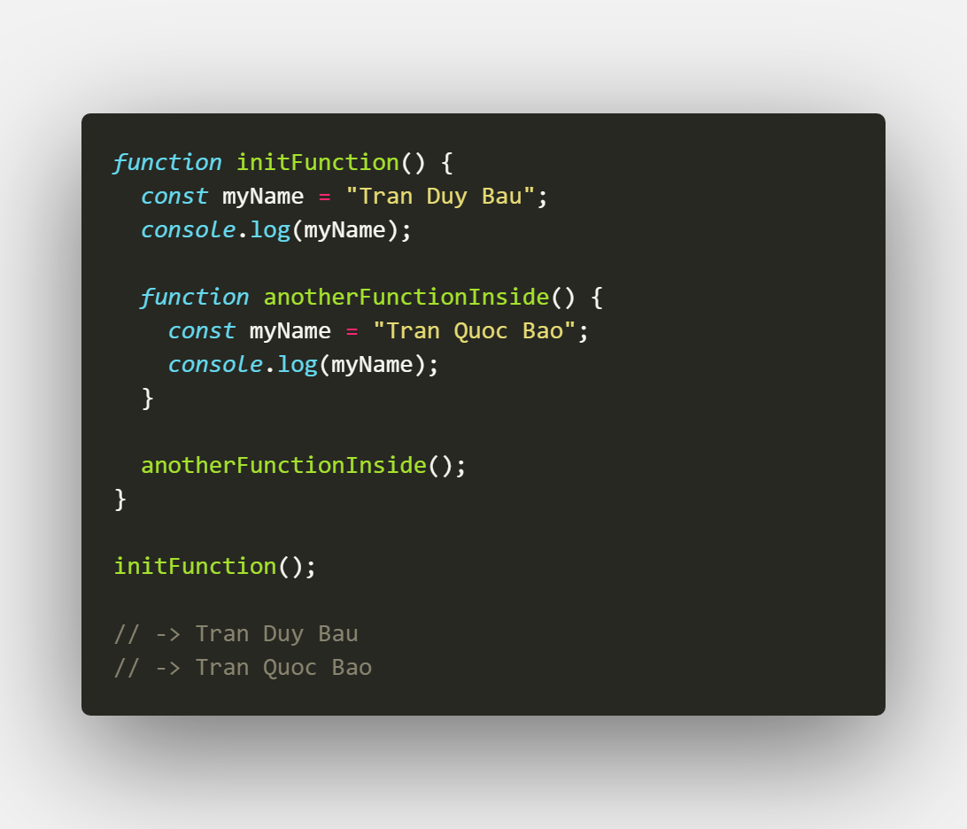 Như các bạn thấy, mình gán Hằng bằng const cho biến myName 2 lần, nhưng không có lỗi, bởi vì mỗi biến myName ràng buộc bởi chính function bên ngoài, hay những biến này là những local variables của chính Scope đấy, chứ không phải của function bên ngoài. Nhiều bạn có thể sử dụng Function Scope thay cho Local Scope, yep, that's okey