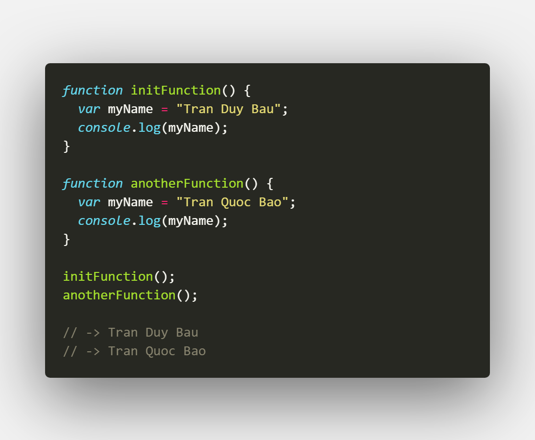 Đơn giản, khi bạn đang ở trong 1 Function, bạn đang làm việc trong 1 Local Scope. Mỗi 1 Function, chúng ta có 1 Local Scope khác nhau, và các biến bên trong mỗi Scope này là khác nhau: