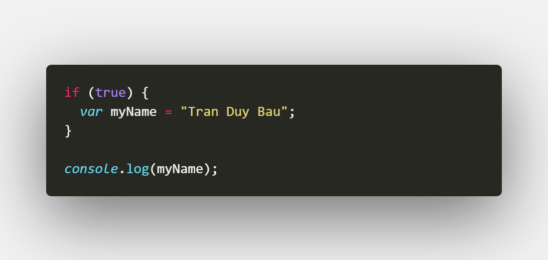 Như các bạn có thể thấy, biến myName lần này được đặt trong 1 câu if, nằm trong Global Scope, do đó ở Global Scope ta dễ dàng gọi biến và sử dụng.