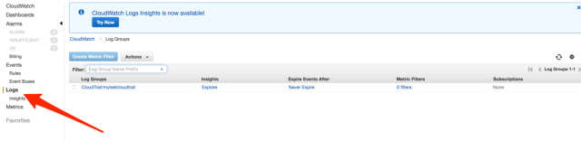 Trong CloudWatch logs, bạn sẽ thấy logs group mới được tạo