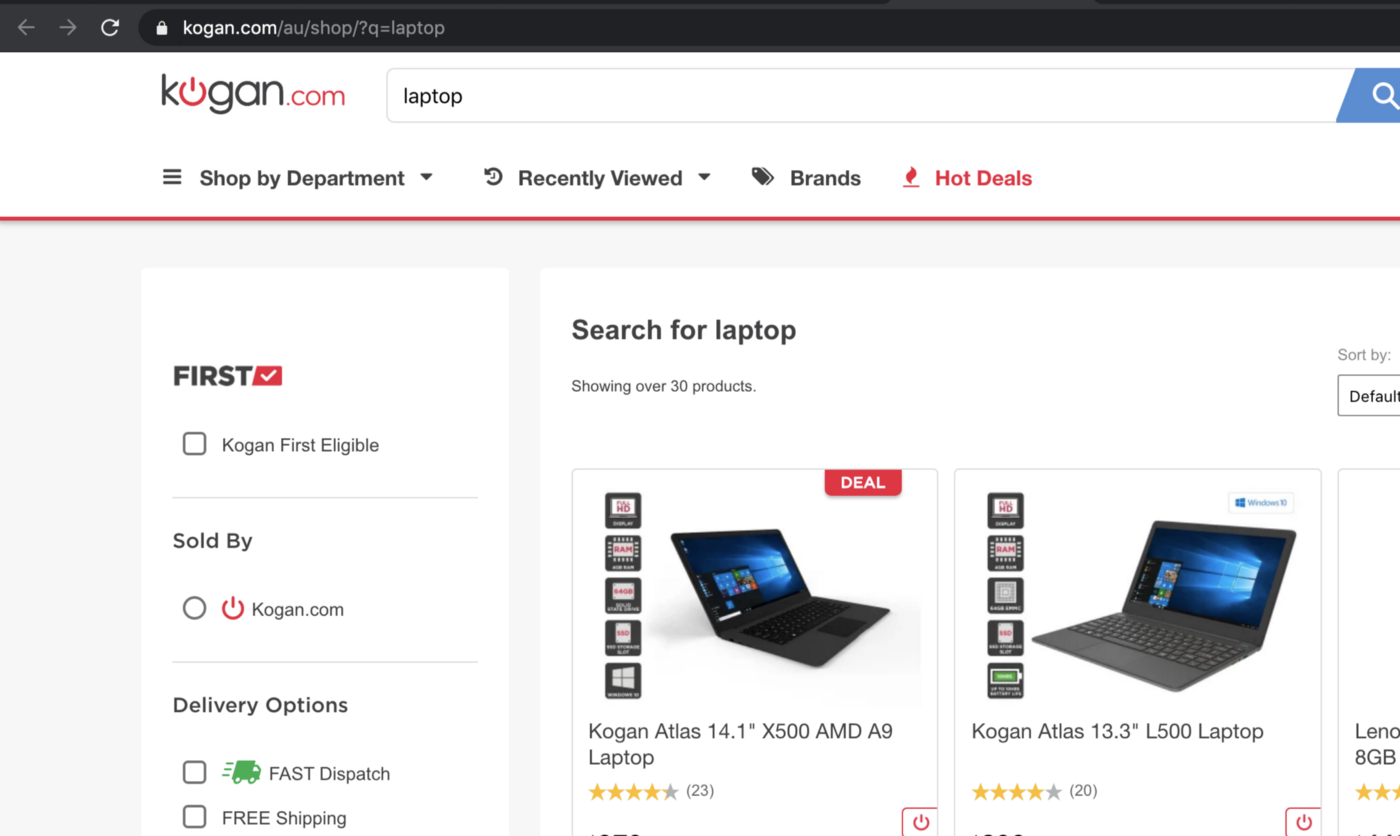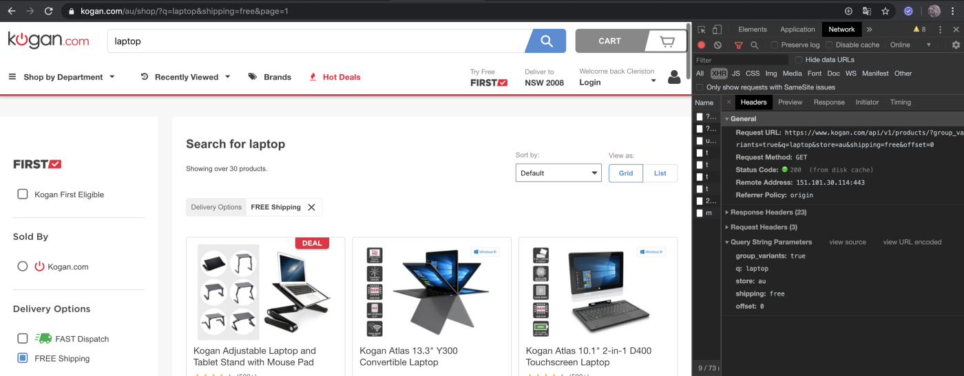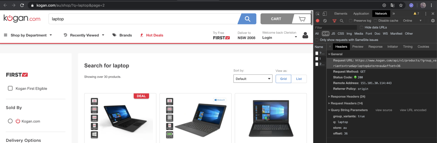 A. Truy cập https://www.kogan.com/au/shop/?q=laptop và nhấp vào bất kỳ bộ lọc nào (ví dụ "FREE shipping"). Trang web sẽ thực hiện một GET request mới, lấy response, hiển thị lại (re-render) danh sách các sản phẩm, cập nhật địa chỉ url của trình duyệt và lưu url trong lịch sử trình duyệt (không nhất thiết phải theo thứ tự này). Mặc dù trang không được làm mới, truy vấn mới vẫn được đẩy vào lịch sử trình duyệt, do đó bạn sẽ có thể điều hướng trở lại trang ban đầu.