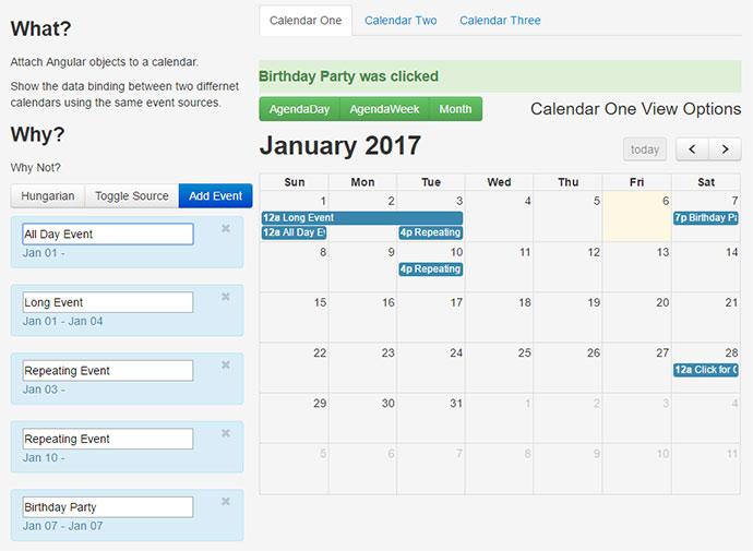 Thư viện này đặc biệt sử dụng cho nền tảng AngularJS. Cho phép add các event vào calendar, vô cùng tiện lợi.