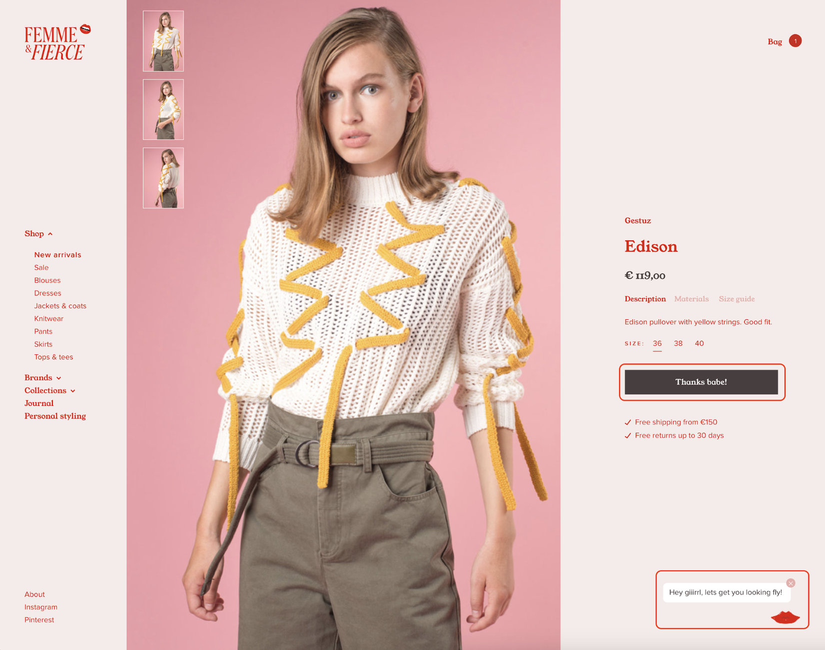 Femme & Fierce là một ví dụ điển hình về một công ty triển khai UX writing và microcopies. Các văn bản nút chẳng hạn như "Cảm ơn em yêu!" và những thông điệp như "Hãy giúp bạn trông như bay!" thể hiện sự nhanh nhẹn và dũng cảm của thương hiệu.