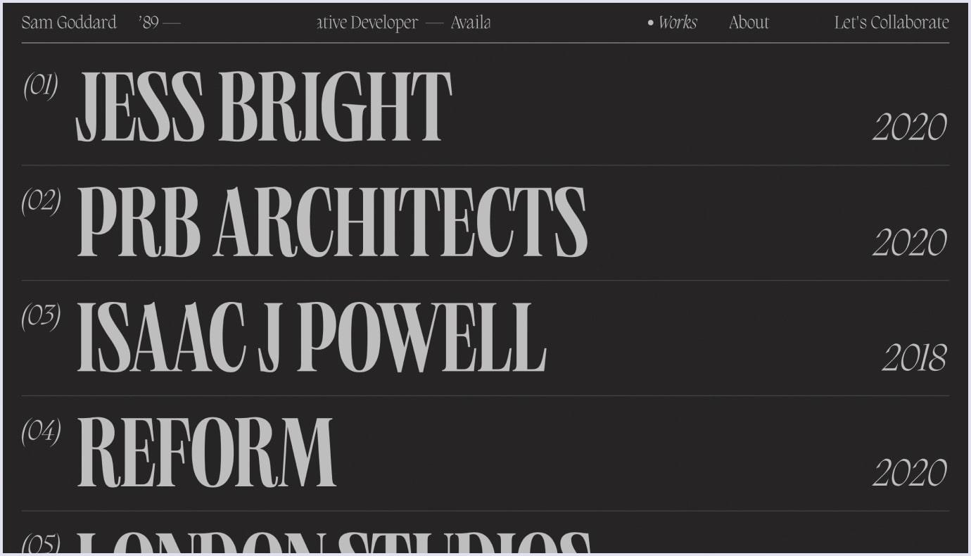 Một ví dụ tuyệt vời khác về xu hướng giao diện người dùng này mà chúng ta có thể thấy trên trang web của nhà phát triển sáng tạo Sam Goddard.