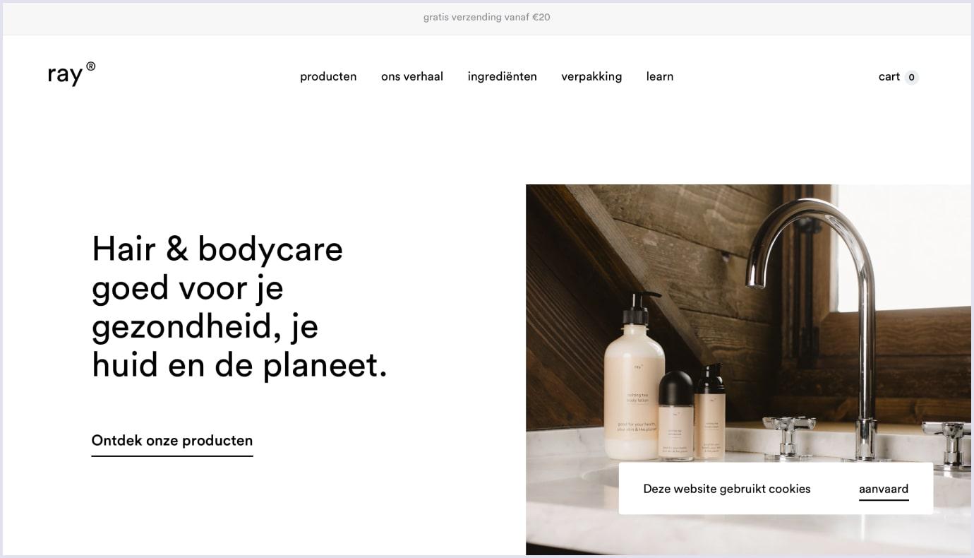 Một thương hiệu chăm sóc tóc và cơ thể Ray đã tạo ra một thiết kế web đơn giản và thanh lịch bằng cách sử dụng xu hướng giao diện người dùng này.