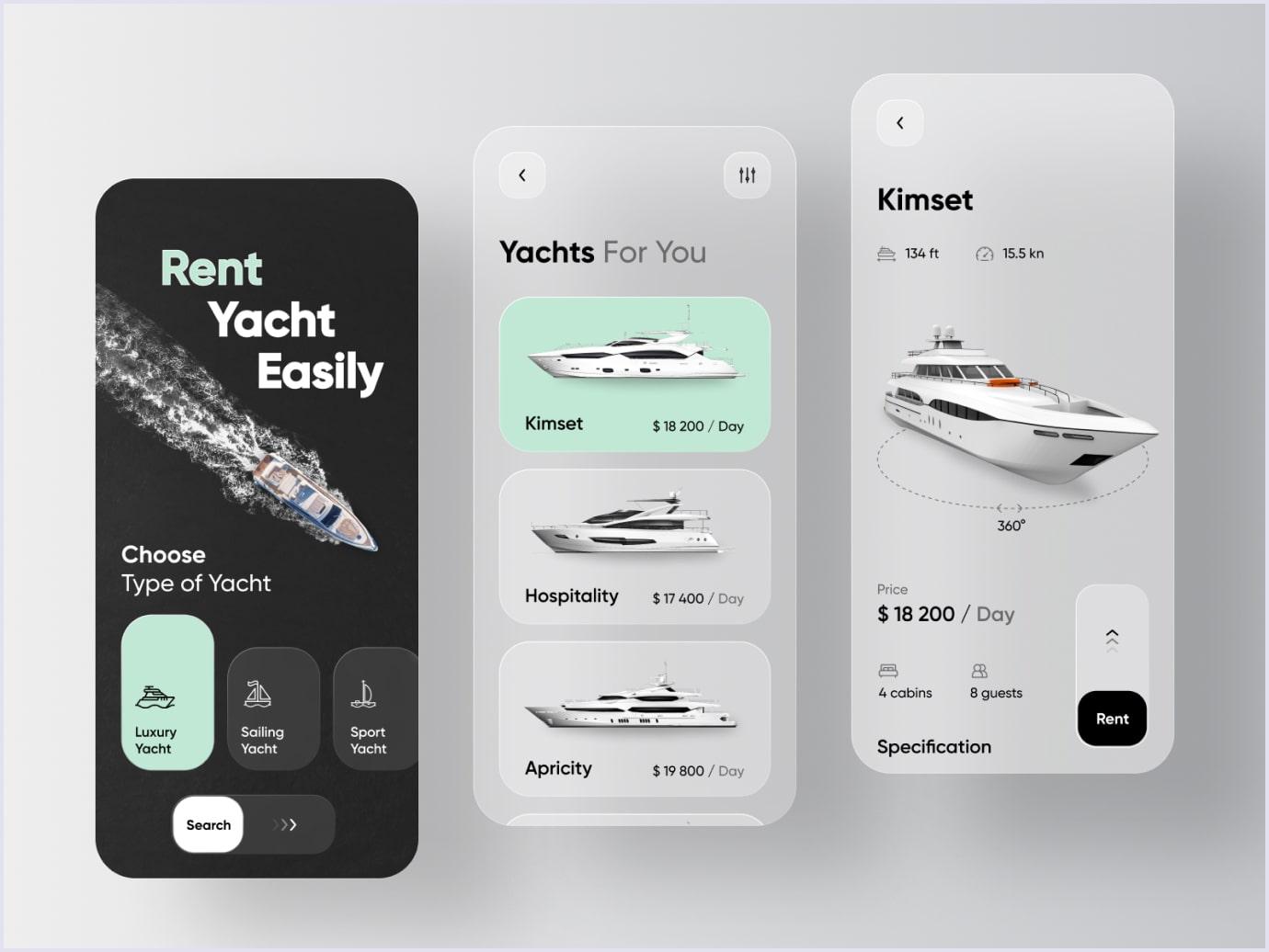 Dưới đây, bạn có thể thấy Yacht Booking Service Application trông phong cách như thế nào với sự trợ giúp của xu hướng thiết kế web Glassmorphism.