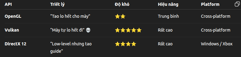 Vulkan cũng được phát triển bởi Khronos Group, và về bản chất nó cũng là một graphics API. Tuy nhiên, nếu OpenGL là một API trừu tượng cao, “lo hộ” cho lập trình viên rất nhiều thứ, thì Vulkan lại đi theo hướng ngược lại 💀.