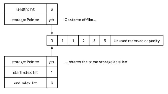 Với việc slice mảng bắt đầu từ phần tử thứ 2. Kiểu của kết quả trả về là ArraySlice, không phải Array, ArraySlice là 1 view về mảng. Nó được hỗ trở bởi mảng gốc, tuy nhiên nó cung cấp cái nhiều dựa trên slice. Điều này chắc chắn rằng mảng không cần sao chép. Kiểu ArraySlice có cùng những hàm định danh như Array, nên bạn có thể sử dụng 1 slice như mảng nếu trước đó nó là mảng. Nếu bạn muốn chuỷen 1 slice thành 1 mảng, bạn cần cấu trúc 1 mảng mới từ slice: