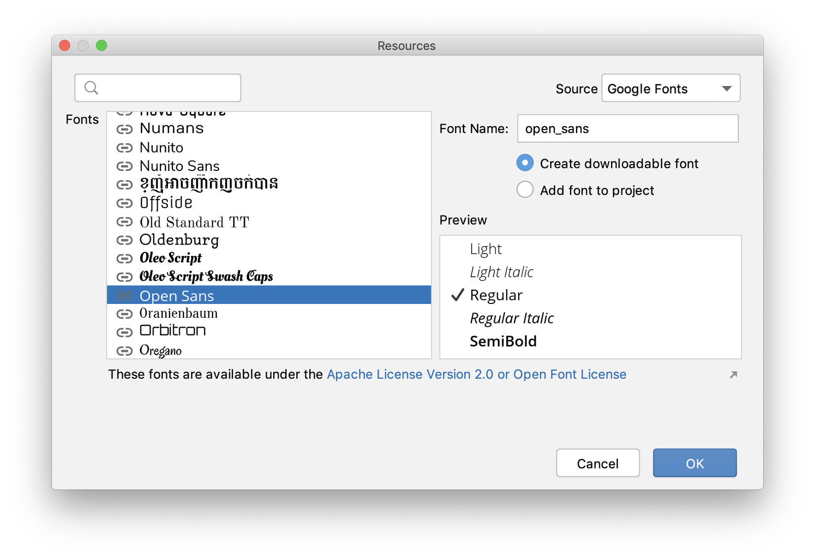 Tìm open-sans, chọn “Create downloadable font” và nhấn OK. Tại thời điểm này, Android Studio sẽ tạo tất cả các tệp cần thiết cho phông chữ này: open_sans.xml, font_certs.xml và preloaded_fonts.xml.