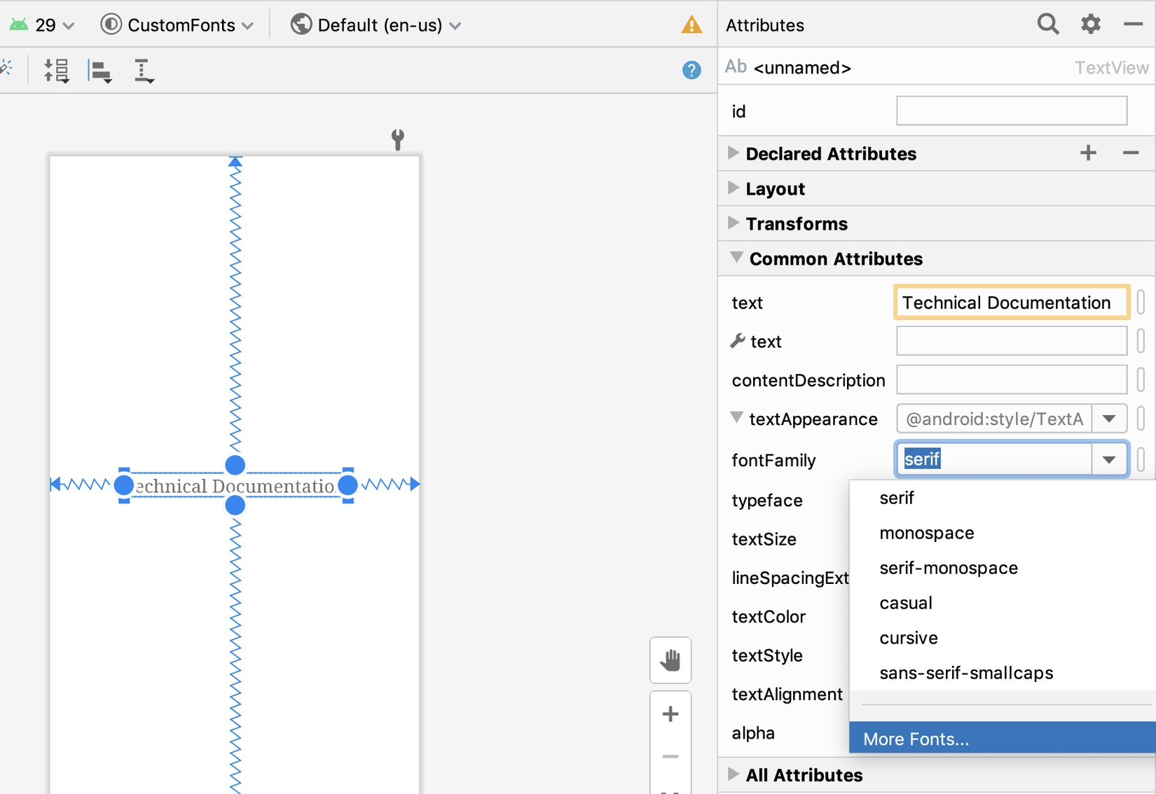 Chọn một số TextView trong design editor và click vào “More fonts” trong thuộc tính font-family. Tại đây, bạn sẽ tìm thấy danh sách các phông chữ có thể tải xuống từ thư viện phông chữ của google.