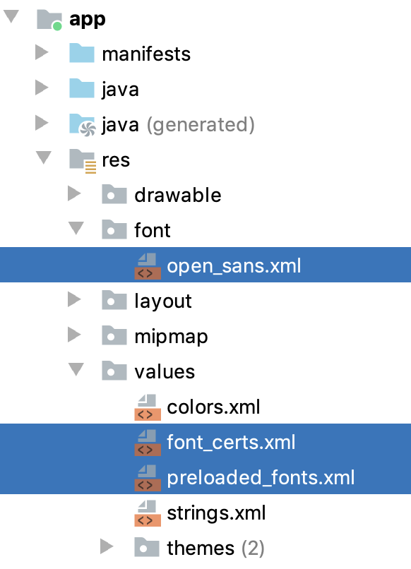 open_sans.xml mô tả phông chữ chúng ta muốn sử dụng, font_certs.xml xác minh danh tính ứng dụng của nhà cung cấp phông chữ và preloaded_fonts.xml trợ giúp bằng cách tải trước phông chữ cho ứng dụng của chúng ta.