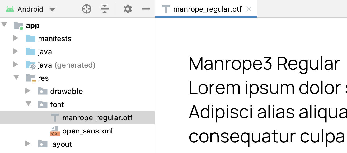 Bây giờ chúng ta cần tạo một resource cho phông chữ được thêm vào. Ta sẽ gọi nó là res/font/manrope_font.xml: