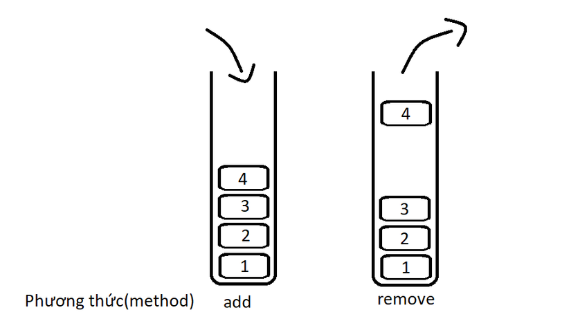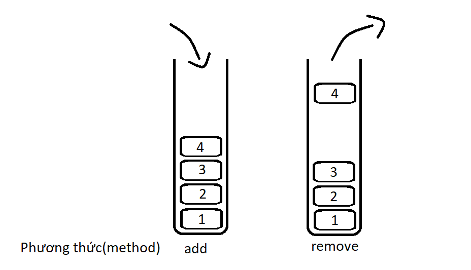 Trong cấu trúc này các phân tử sẽ được lữu trữ và tuân theo nguyên tắc LIFO - Last In First Out, tức là vào trước ra sau, vào sau ra trước. Trông nó giống như cái ống đựng cầu lông vậy: