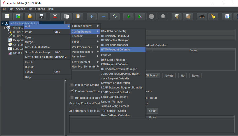 - Right click Test Plan -> Add -> Config Elements -> HTTP Request Defaults