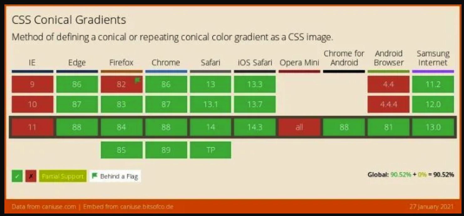 Chức năng conic-gradient có thể được sử dụng để tạo ra một loạt các mẫu hình ảnh thú vị như hình nón, biểu đồ hình tròn, bánh xe màu và bề mặt bóng.