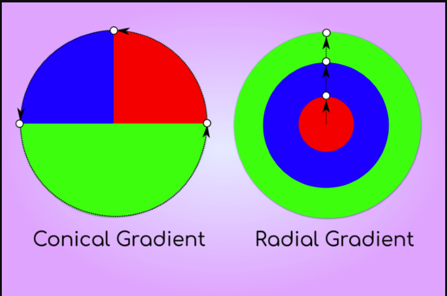 Các gradient hình nón xoay các điểm dừng màu xung quanh một điểm trung tâm (thay vì tỏa ra từ một điểm trung tâm như gradient xuyên tâm). Các điểm dừng màu gradient hình nón được đặt xung quanh chu vi của một vòng tròn.