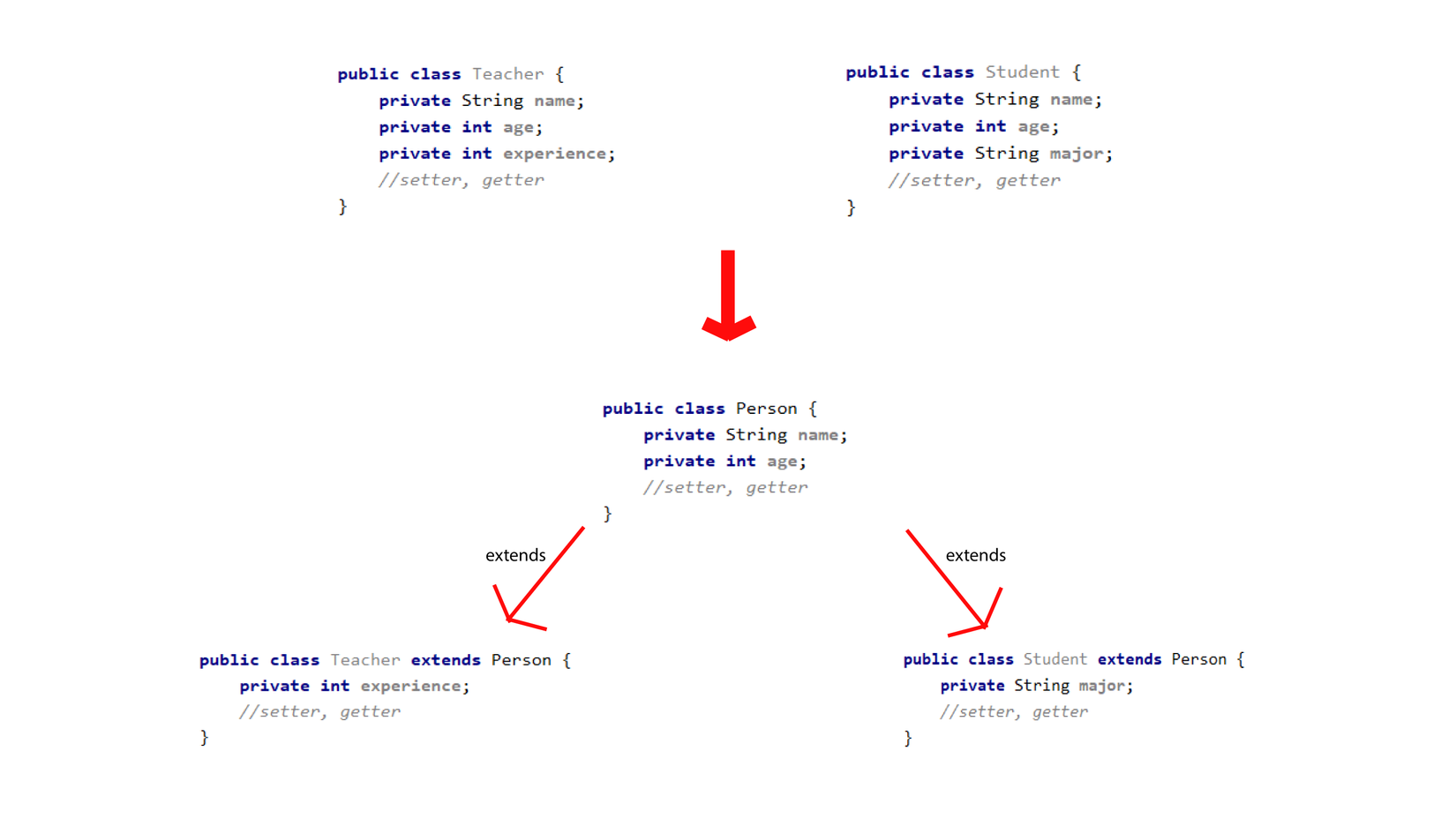 Chúng ta thấy rằng 2 lớp Student và Teacher có chung hai thuộc tính là name và age. Vậy làm sao để chỉ cần khai báo hai thuộc tính này một lần? Trong trường hợp có 2 lớp thì ok, tôi khai báo lại cũng được. Nhưng khoan, nếu có tới cả chục, cả trăm lớp cần đến hai thuộc tính này thì sao? Tôi phải khai báo lại 100 lần ư?