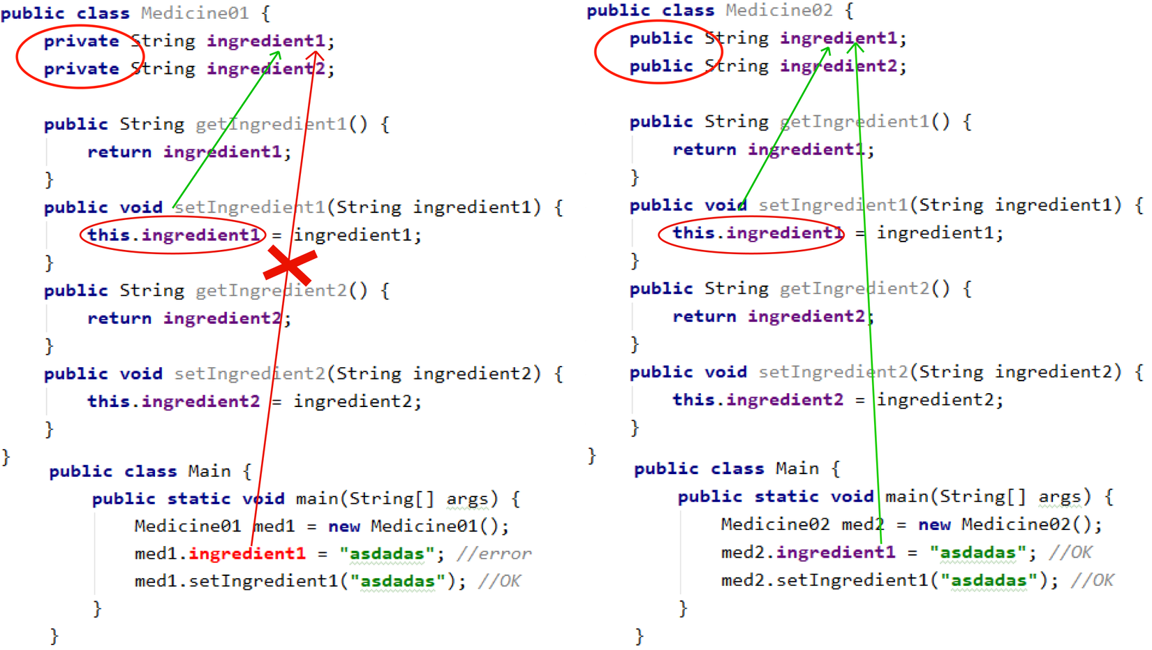 - Chúng ta thấy ở chế độ public thì ta có thể truy nhập tới trường dữ liệu đó ở trong class và cả ngoài class (ở đây mình truy cập từ class Main mà vẫn ok). Còn nếu để ở chế độ private thì chỉ có bên trong class mới truy nhập được. Đó chính là những biểu hiện đầu tiên cho tính bao đóng (encapsulation).