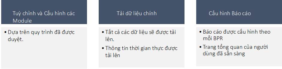 Việc tuỳ chỉnh và cấu hình các Mô-đun trong quá trình triển khai ERP phải được thực hiện theo một trình tự và mỗi mô-đun sẽ có chu kỳ triển khai riêng. Tài liệu Quy trình cần nắm bắt tất cả các khía cạnh của các yêu cầu về cấu hình và phát triển (nếu có)