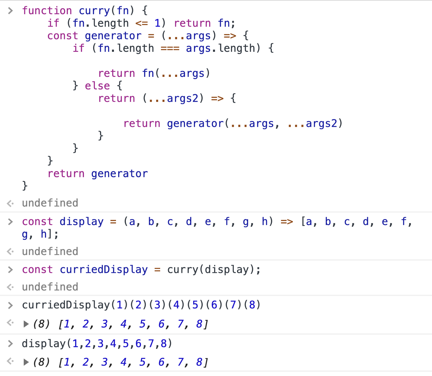 Currying là một kỹ thuật đánh giá hàm với nhiều đối số, thành một chuỗi các hàm với một đối số duy nhất. Nói cách khác, khi một hàm, thay vì nhận tất cả các đối số cùng một lúc, lấy đối số đầu tiên và trả về một hàm mới nhận đối số thứ hai và trả về một hàm mới nhận đối số thứ ba, v.v. cho đến khi tất cả các đối số đều hoàn thành. Tại sao nó hữu ích?