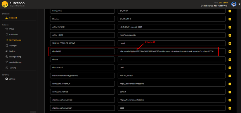 Paste Private IP vừa copy vào biến môi trường của Backend dùng để kết nối với database: