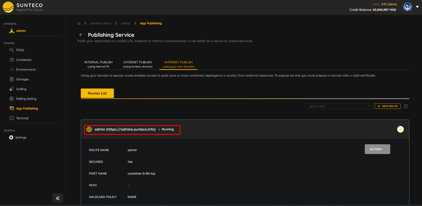 Sau khi tạo thành công, truy cập vào màn hình App Publishing, tab Internet Publish (using your own domain) để tạo domain cho backend: