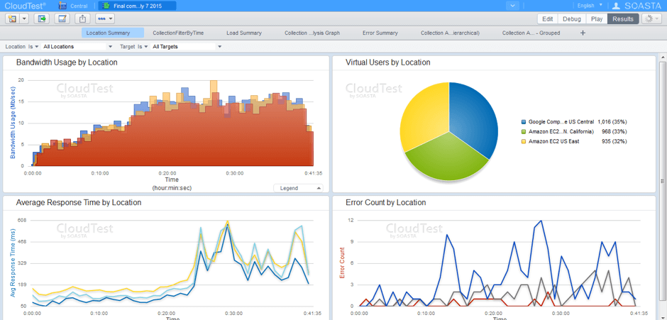 Công cụ kiểm thử phần mềm CloudTest giúp bạn kiểm tra các website và ứng dụng trên di động một cách linh hoạt, nhanh chóng. SOASTA CloudTest có thể kiểm tra khả năng chịu tải của các ứng dụng theo vị trí địa lý khác nhau, đặc biệt 2 khâu integration và phân tích thời gian thực giữa các monitoring, test design, reporting đều được tiến hành một cách liền mạch.
