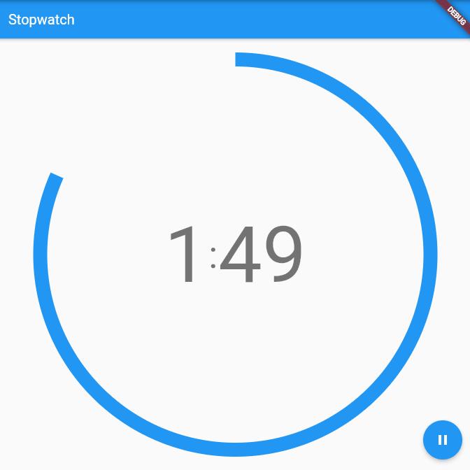 Bởi vì Flutter có rất nhiều widget hấp dẫn về mặt hình ảnh, chúng ta có thể đạt được nhiều kết quả mà ta mong muốn. Ví dụ, Flutter cung cấp một CircularProgressIndicator. Widget này cho phép chúng ta hiển thị tiến trình hoạt động trong một vòng tròn. Một widget khác, được gọi là Stack, cho phép chúng ta xếp chồng các widget lên nhau. Vì vậy, bằng cách sử dụng hai widget này, chúng ta có thể hiển thị tiến trình của đồng hồ bấm giờ và cũng thêm một số nét tinh tế bằng cách hiển thị chúng ta đi được bao xa qua từng phút với CircularProgressIndicator ở bên ngoài. Như thế này: