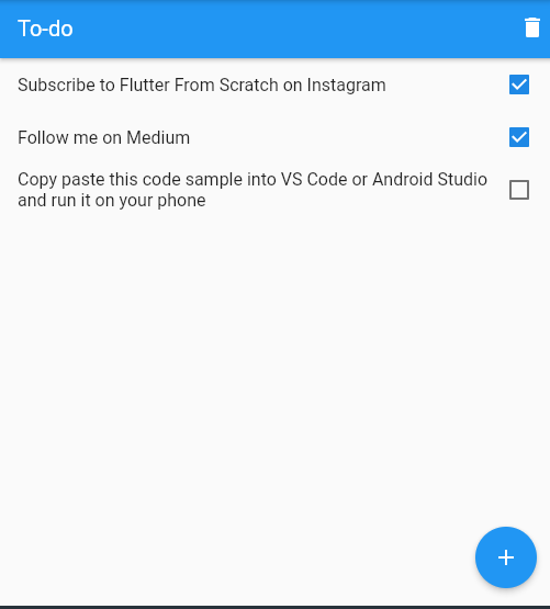 Chúng ta cũng sử dụng hàm showDialog để hiển thị dialog “new task” và xử lý giá trị trả về của hộp thoại đó để thêm task mới vào danh sách. Để làm điều này, chúng ta sử dụng AlertDialog đi kèm với Flutter cùng với một background shadow rất đẹp được thêm sẵn trong Flutter. Có 126 dòng, bạn dễ dàng sao chép code vào editor và chạy thử.