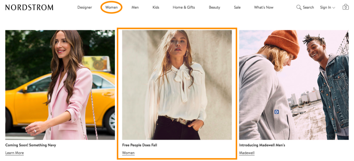Ví dụ ở trên thì các bạn thấy đấy, chúng ta có 1 category 'Women' ở trên thanh điều hướng, nhưng bạn cũng có thể thấy nó ở dưới cái ảnh mà khoảnh tròn, khi đó tạo thuận lợi cho người dùng là muốn xem thêm những sản phẩm của 'Woman' category thì có thể bấm ngay vào đó mà không cần lướt lên thanh điều hướng trên menu để ấn vào nữa.