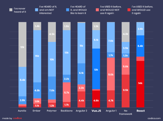 Như bạn có thể thấy, về cơ bản, không có ai từng nghe về React và chỉ có một tỷ lệ nhỏ trong số những người đó không có hứng thú với nó hoặc sẽ không sử dụng nó nữa. Sự phổ biến của React đến từ tốc độ của nó (Virtual DOM), các thành phần có thể tái sử dụng, dễ dàng học tập và nó được hỗ trợ nhiều từ cộng đồng developer. Điều này cũng có nghĩa là nếu bạn đang tìm kiếm việc làm, React sẽ là lựa chọn tốt nhất của bạn khi nói đến các thư viện và frameworks khác ngoài kia.