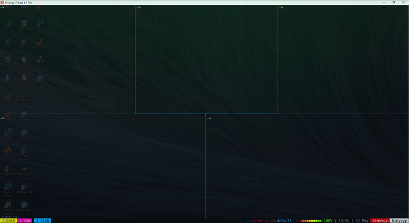 Khi sử dụng WSL2, chúng ta có nguyên một bản Ubuntu/Debian ngay trên Windows để sử dụng. Hãy dùng thêm các phần mềm Tmux, Terminator... để có thể giúp chúng ta chi nhỏ 1 màn hình terminal thành nhiều cái nhỏ hơn. VD với Tmux sẽ như bên dưới: