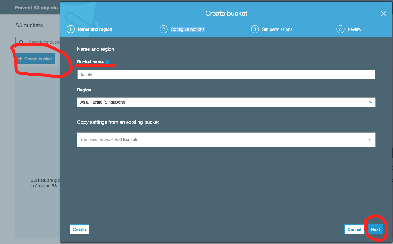 Cái này khá đơn giản, bạn đăng nhập vào service S3 của Amazon, chọn Create bucket rồi Next, Next,... để Configure options cũng như Set permission là xong