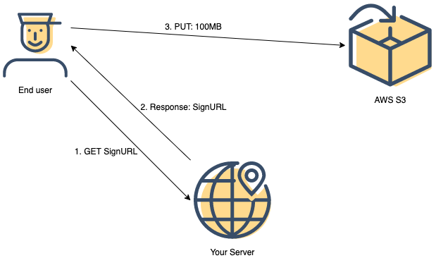 Có nghĩa là bạn sẽ gửi 1 request lên server để yêu cầu 1 url(có permission) để PUT/GET với S3. Server sẽ sinh ra một url có kèm signature + expire date. Client sẽ call trực tiếp lên s3 qua url đó để PUT/GET object.
