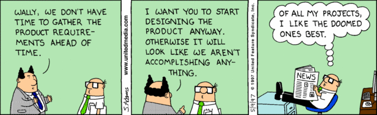 Có một phim hoạt hình Dilbert cartoon tuyệt vời, ông chủ đã nói với Wally rằng anh ấy phải bắt đầu thiết kế vì họ không có thời gian viết requirement. Điều đó rất buồn cười cho đến khi đó là những gì ông chủ của bạn thực sự làm.