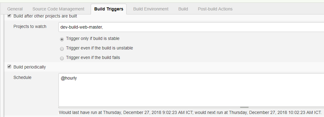 - Lên lịch cho công việc trong công cụ CI / CD của bạn (ví dụ: Jenkins, Bamboo, v.v.), một cái gì đó tương tự như trình kích hoạt bên dưới.