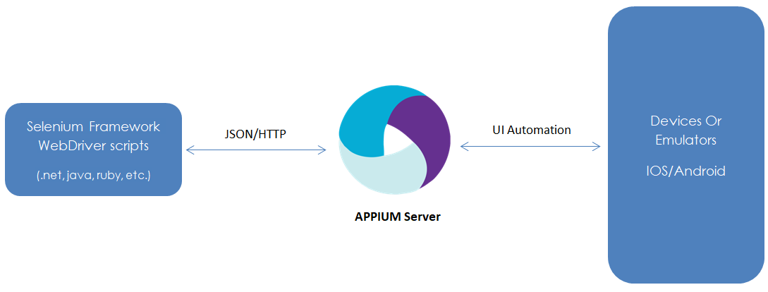 Về cơ bản, một khi bạn đã kiến trúc khung Selenium của mình đủ tốt, thì việc tích hợp với Appium chỉ đơn giản là tạo một iOSDriver hoặc AndroidDriver mới bằng cách sử dụng mẫu thiết kế Factory. Sau đó, các test case của bạn sẽ tương tác với các thiết bị iOS / Android thông qua Máy chủ Appium như bên dưới.