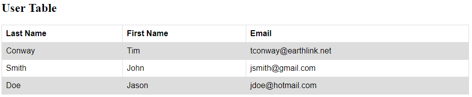 Ví dụ: chúng ta có một bảng hiển thị thông tin về người dùng như Họ, Tên và Email như bên dưới.